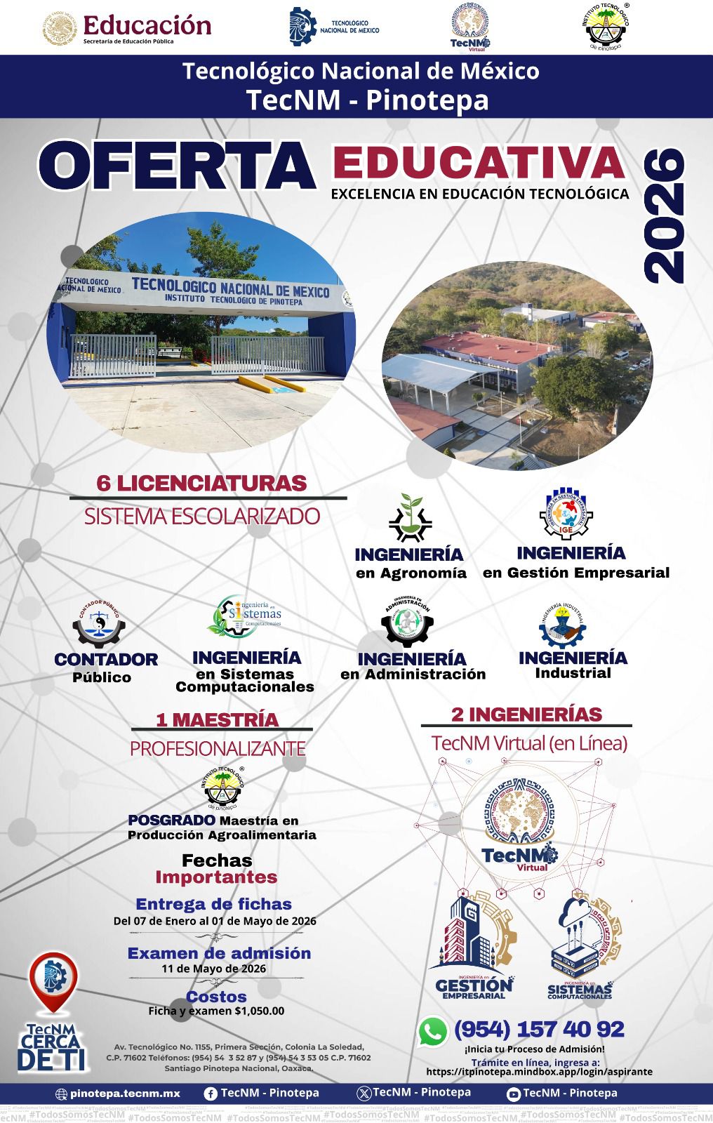 El Tecnológico Nacional de México – Pinotepa invita a todos los egresados de nivel medio superior y superior que deseen ingresar en el periodo lectivo del ciclo escolar agosto-diciembre 2026 a una de nuestras seis carreras profesionales presenciales y dos carreras en línea virtual, además de un posgrado en Maestría en Producción Agroalimentaria. Por lo anterior, les proporcionamos la siguiente convocatoria de admisión 2026.